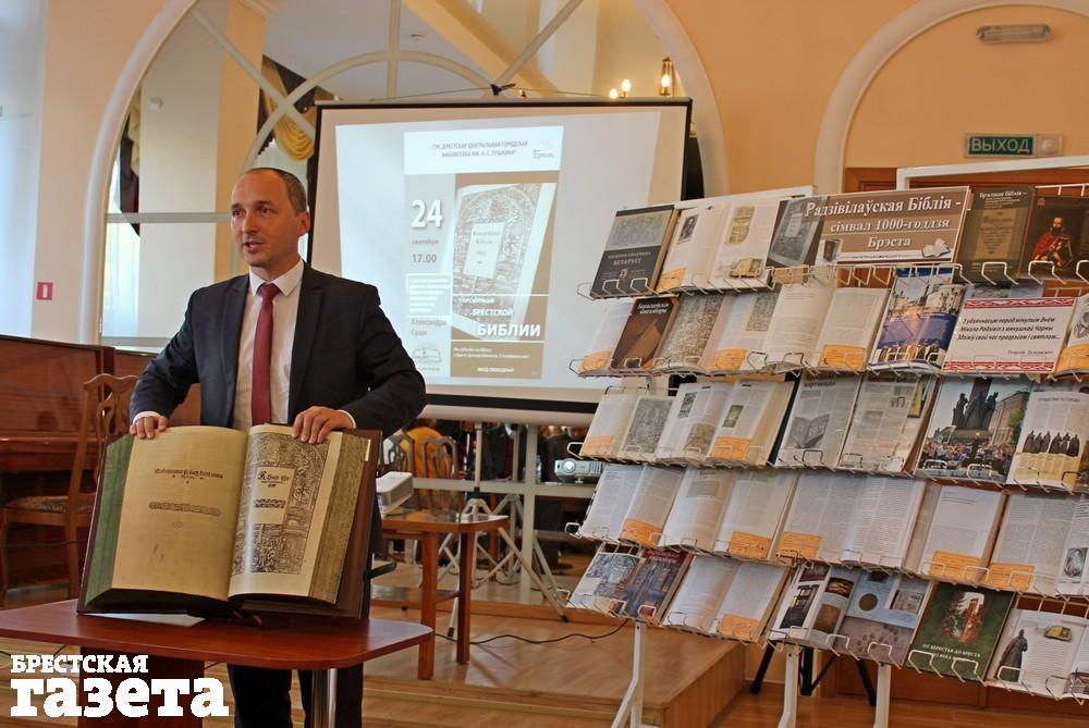 Факсимильное издание Брестской Библии представили публике в Брестской центральной городской библиотеке 24 сентября. Самая большая книга в истории отечественной печати весит 15 кг и насчитывает более 1 400 страниц. Кожа, металлические заклепки, два титульных листа, гравюры – это все о ней. Воссозданы все особенности оригинала: размер, характер печати, бумага, рукописные надписи и пометки на страницах книги. Полностью вручную был выполнен специальный переплет.