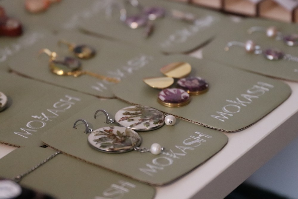 Алеся паказвае мне ўпрыгожваніі, якіх у краме таксама даволі шмат. Bioevgenika, Anngera, Wood Family, Mokash, Warmth&Soul — пазнаю працы знаёмых беларускіх майстроў.