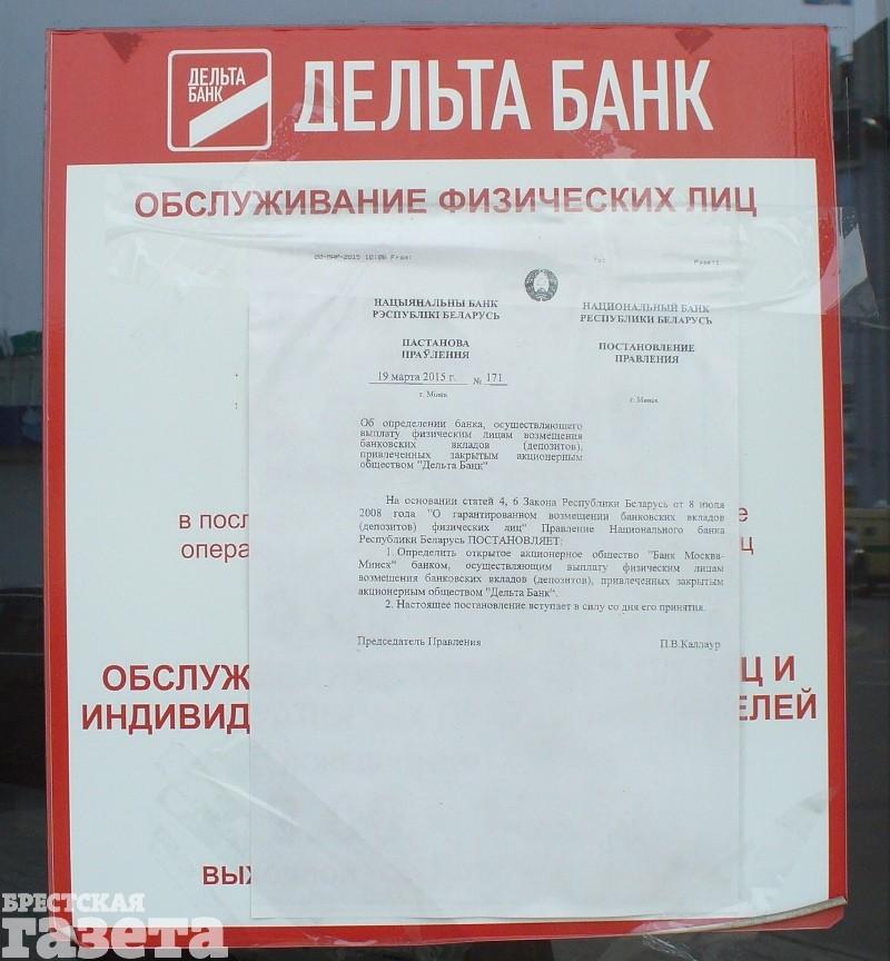 Наш Национальный банк 12 марта ввел на ЗАО «Дельта Банк» временную администрацию по управлению банком, а 17 марта принял постановление о том, что возмещать вклады в закрытом банке будет «Банк Москва-Минск». Агентство по гарантированному возмещению депозитов подготовило перечень отделений банков, в которых вкладчики «Дельта Банка» могут написать заявление на возврат средств. Кроме того, определен перечень отделений «Банка Москва — Минск», где можно будет забрать сами вклады. Соответствующая информация размещена на сайте агентства. Так, в Бресте, заявления начиная с 30 марта подаются на Машерова, 52, а получать вклады будут по адресу ул. Коммунистическая, 24. Согласно законодательству, вернуть деньги должны в течение месяца со дня подачи заявления.