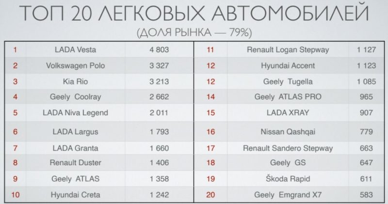 В топ-10 самых продаваемых автомобилей в 2021 году в Беларуси вошли LADA Vesta, Volkswagen Polo, Kia Rio, Geely Coolray, LADA Niva Legend, LADA Largus, LADA Granta, Renault Duster, Geely ATLAS и Hyundai Creta.