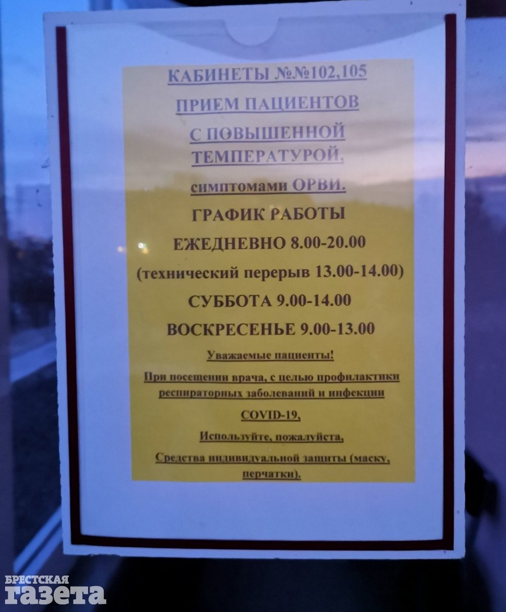 Утром 2 февраля стало известно, что власти приняли решение о работе поликлиник и по выходным дням. Начиная с ближайших выходных – 5 и 6 февраля – прием пациентов в поликлиниках (включая и осмотр на дому) Бреста будет осуществляться в субботние и воскресные дни до 18.00.