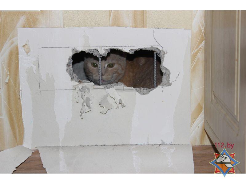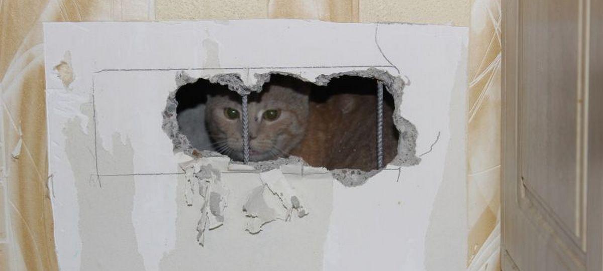 Вместе они выяснили, что кошка находится на уровне первого этажа. Проделав в стене небольшое отверстие, спасатели вызволили животное из бетонной ловушки.