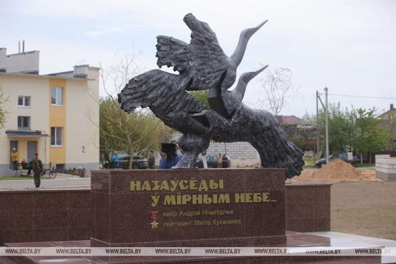 В Барановичах открыли мемориал в честь погибших летчиков Лидской штурмовой авиабазы майора Андрея Ничипорчика и лейтенанта Никиты Куконенко. На постаменте установили скульптурную композицию в виде улетающих в небо двух кованых журавлей на фоне силуэта самолета Як-130. Коммунальные службы занимались благоустройством прилегающей территории. Об этом сообщает БелТА.
