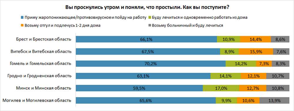 Чаще других простуду на ногах переносят жители Гомеля и Гомельской области — 70,2%. Cреди тех, кто с большей вероятностью останется дома, но при этом будет работать — население Минска и Минской области (17%).