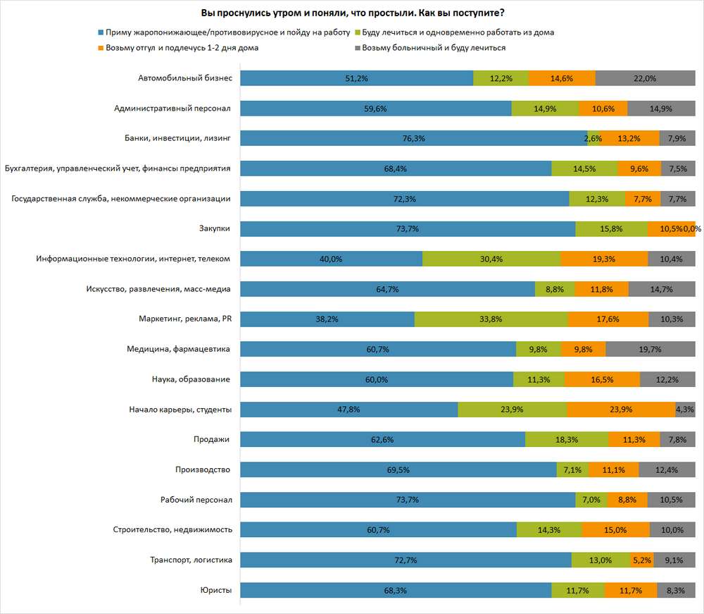 Активнее всех во время болезни на работу ходят банковские служащие — 76,3%, рабочий персонал — 73,7% и представители закупок — 73,7%.
