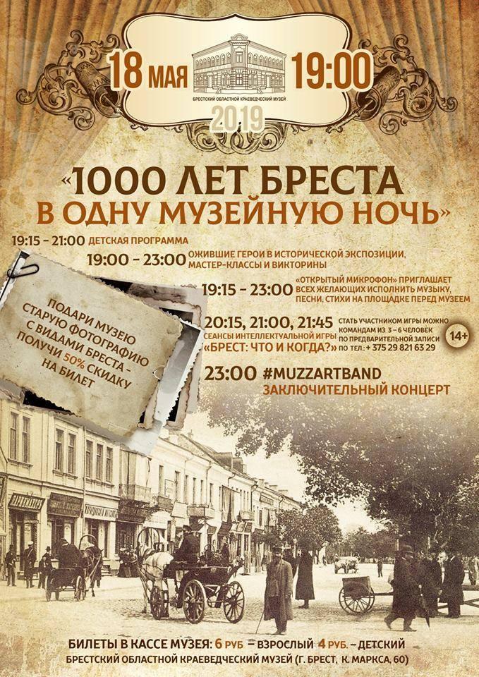 В Брестском областном краеведческом музее 18 мая состоится мероприятие «1000 лет Бреста за одну музейную ночь». Праздничный вечер начнется в 19.15 с детской программы. Далее гостей ждут викторины и мастер-классы.