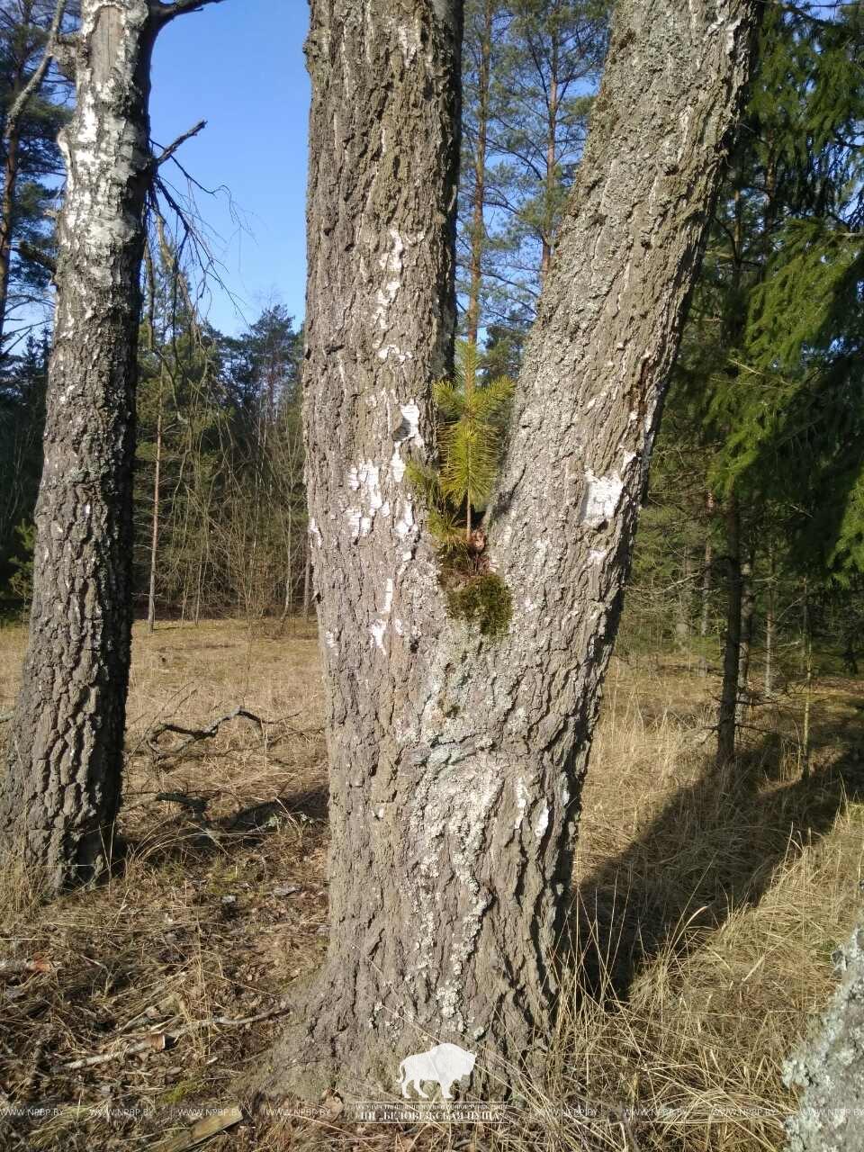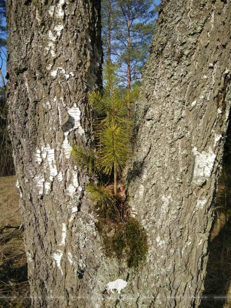 На территории национального парка «Беловежская пуща» возле деревни Белая сотрудники лесной охраны нашли очередной природный феномен. Одним организмом стали жить две древесные породы из «разных миров». Раздвоенная на высоте 1,3 м береза стала субстратом для роста и развития семени сосны. Предположительный возраст березы — 60 лет, сосне около 4-х лет.