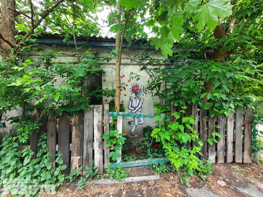 На рисунке, который нанесен на старый дом, изображен коронавирус, смартфон и человек в смирительной рубашке.