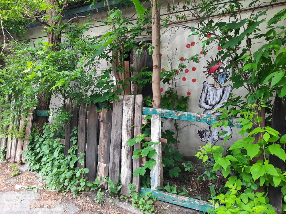 На одном из старых жилых домов, который находится за зданием Почетного консульства Франции в Бресте по адресу улице Гоголя, 46, можно увидеть стрит-арт на тему влияния коронавируса на общество. На рисунке изображен человек в смирительной рубашке и маске, смартфон и иллюстративные молекулы коронавируса.