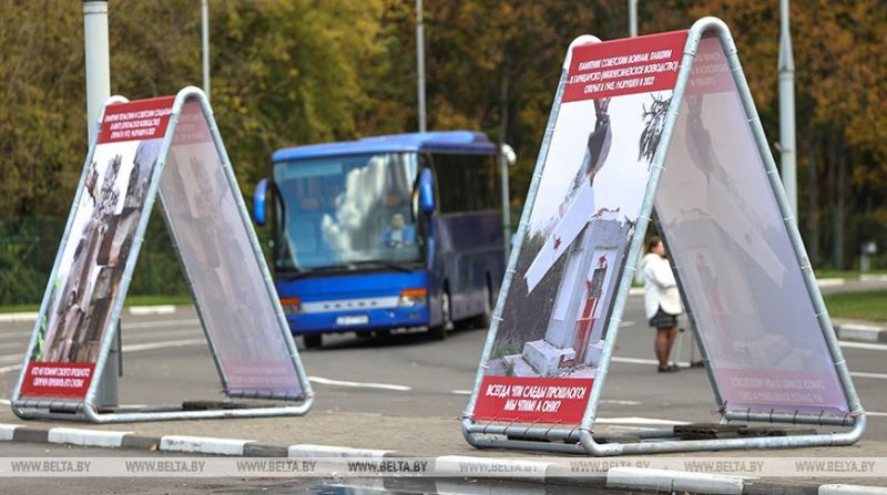 На стендах изображены памятники, которые недавно снесли в разных городах Польши. Например, установленный 50 лет назад памятник польским и советским солдатам в Бжеге Опольского воеводства, памятник Красной армии в Мальборке Поморского воеводства, скульптура с образами воинов-освободителей в Лонжеке Гарнцарском Нижне-Силезского воеводства, памятник Советской армии в Кошалине Западно-Поморского воеводства.