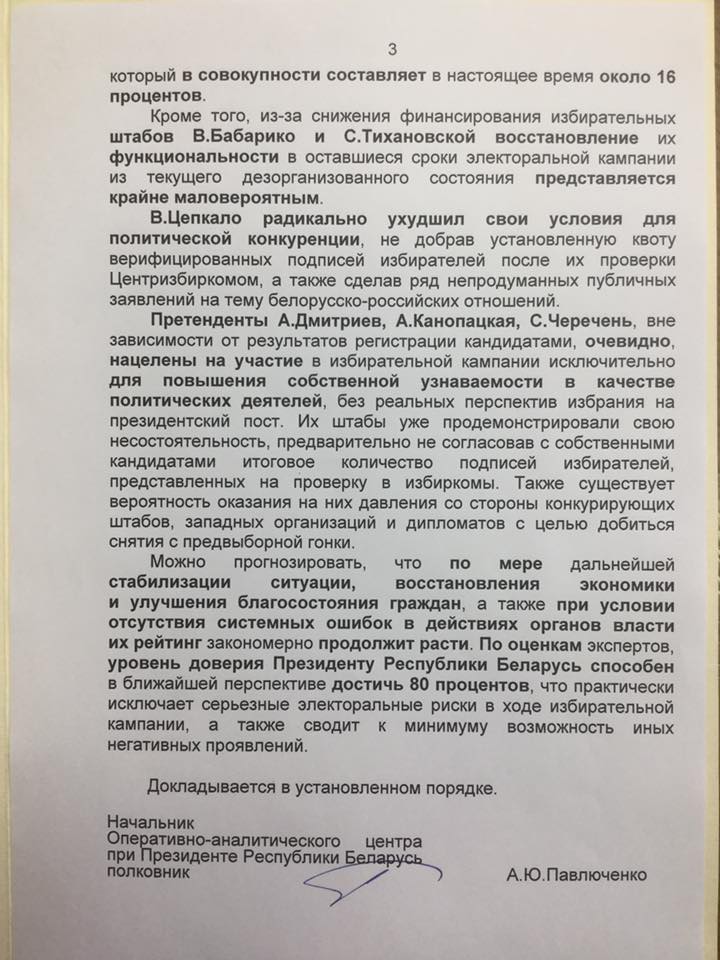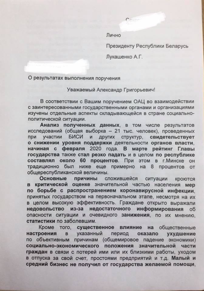 В документе написано, что «в марте рейтинг главы государства стал резко падать и составлял 60%. При этом в Минске он традиционно был ниже еще на 8 процентов».