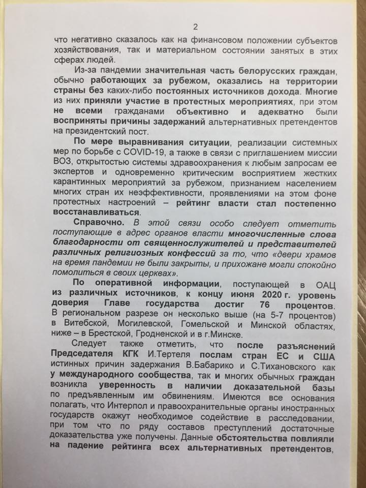 «По оперативной информации, поступающей в ОАЦ из различных источников, к концу июня 2020 года уровень доверия Главе государства достиг 76 процентов», — говорится в документе.