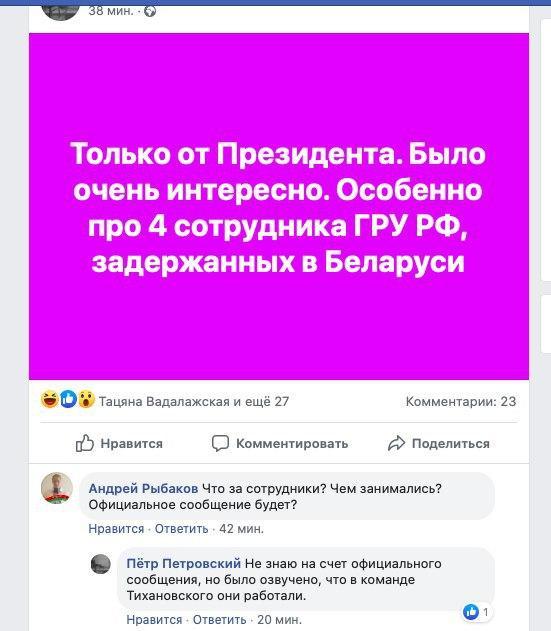 Также один из участников встречи, эксперт Аналитического центра РОО «Белая Русь» и руководитель центра NOMOS Петр Петровский, рассказал у себя в Facebook о задержании сотрудников ГРУ РФ на территории Беларуси. А потом заявил, что это была «шутка», сообщает tut.by.