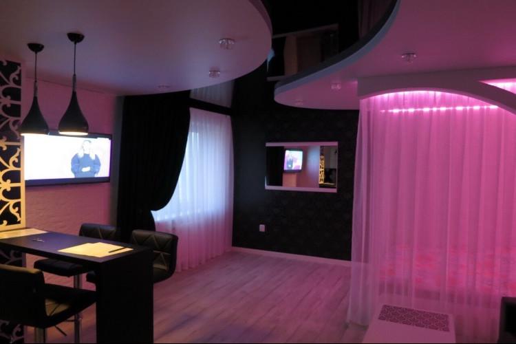 Интересна квартира не только своей планировкой, но и игрой света. Неоновое освещение создает необычную, даже клубную атмосферу. Кстати, там есть также барная стойка.