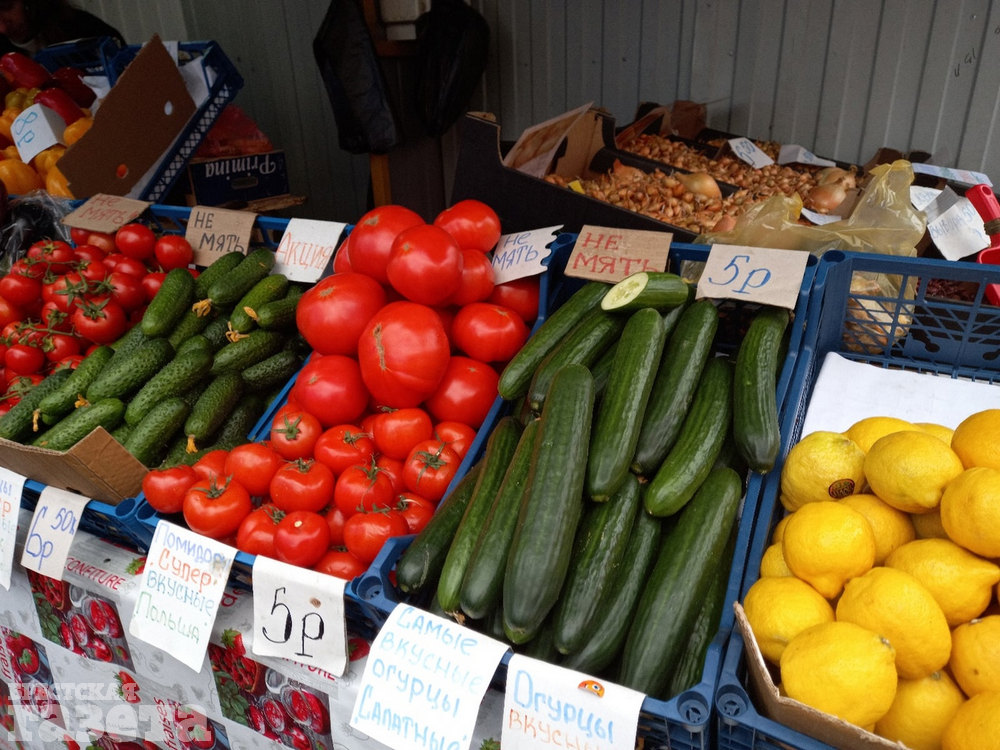 Активно продают на рыночных рядах и огородную зелень (1,5 – 2 рубля за пучок), свежий редис (6 рублей за килограмм), молодую капусту (3 – 3,50 за килограмм), кабачки (6 – 6,50 за килограмм), баклажаны (7 рублей за килограмм) и прочие сезонные (и не только) овощи и фрукты.