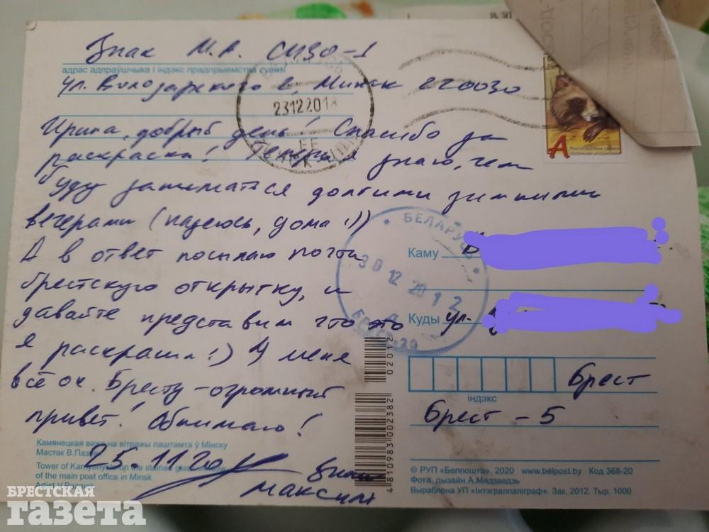 Об этом политзаключенный написал в открытке, которую прислал брестчанке Ирине.