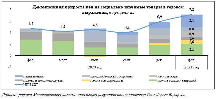 В начале весны Евразийский банк развития сделал неутешительный прогноз для жителей Беларуси. Так, если на 2021 год правительство и Нацбанк Беларуси запланировали инфляцию не выше 5%, то, по оценкам ЕАБР, инфляция в стране останется в диапазоне 8-8,5% год к году в феврале-марте и сохранится выше 7% год к году до октября 2021 года.