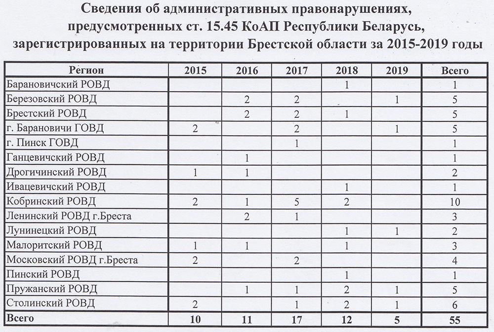 Кроме того, с 2015 года на территории Брестской области зарегистрировано 55 случаев жестокого обращения с животными (статья 15.45 КоАП РБ). «Рекордсменом» является Кобринский регион – 10 правонарушений. В Бресте зафиксировано 4 случая (все в Московском районе города), в Брестском районе – 5.