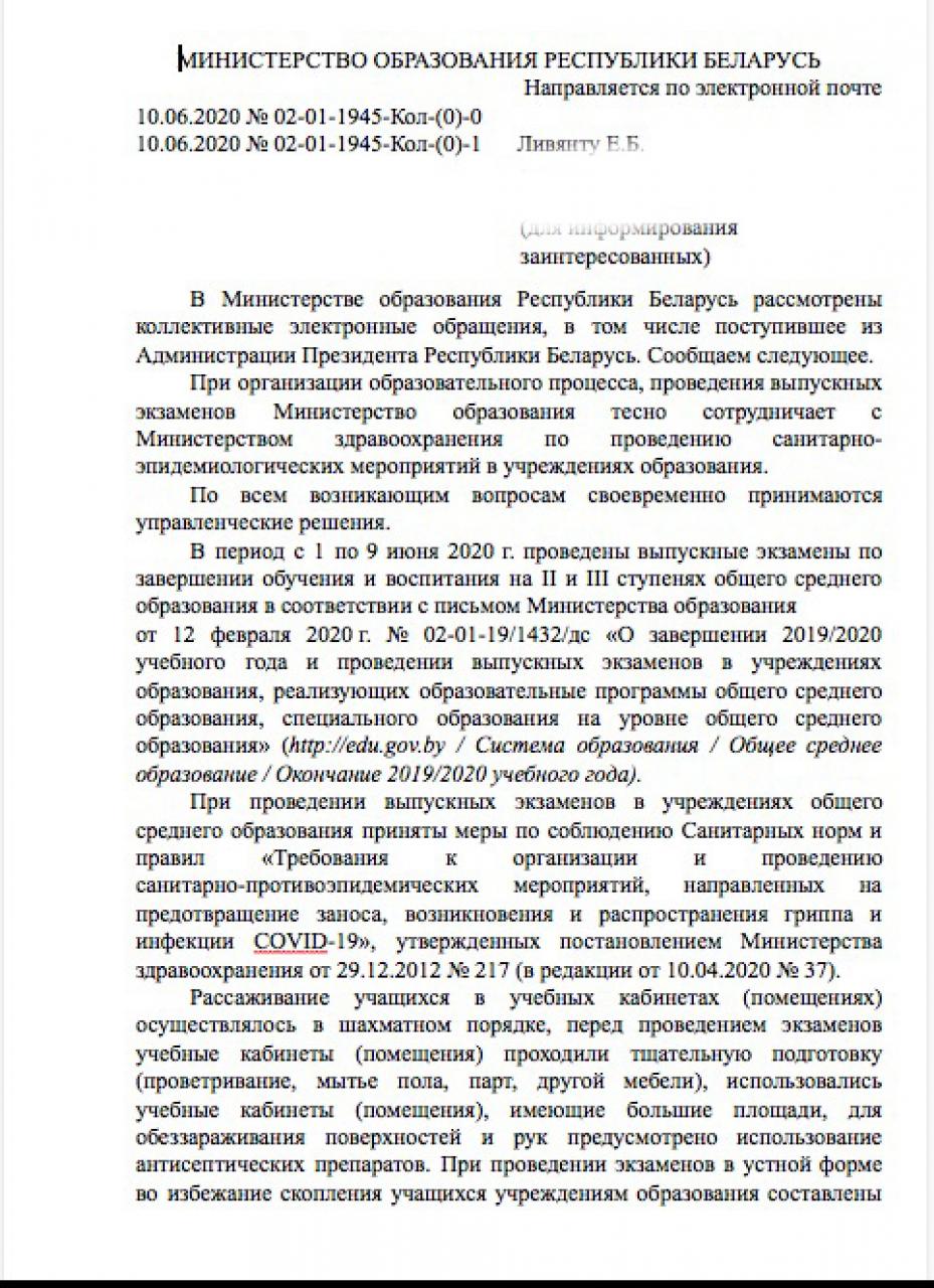 На портале «Удобный город» 10 июня опубликовали ответ Министерства образования на петицию об отмене выпускных и вступительных экзаменов. Она была создана 22 мая и за несколько дней набрала почти 10 тысяч подписей, после чего ее отправили в Администрацию президента и Министерство образования Республики Беларусь.