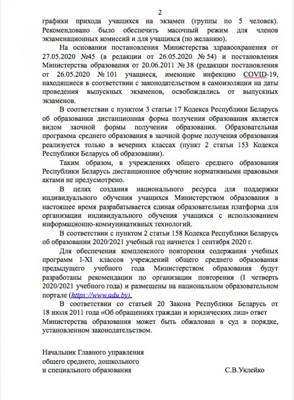 Кроме того, в ответе говорится, что «в учреждениях общего среднего образования Республики Беларусь дистанционное обучение нормативными правовыми актами не предусмотрено. В целях создания национального ресурса для поддержки индивидуального обучения учащихся Министерством образования в настоящее время разрабатывается единая образовательная платформа для организации индивидуального обучения учащихся с использованием информационно-коммуникативных технологий».