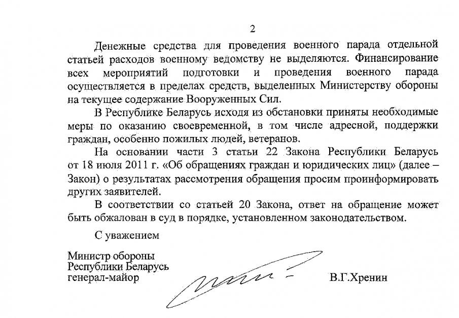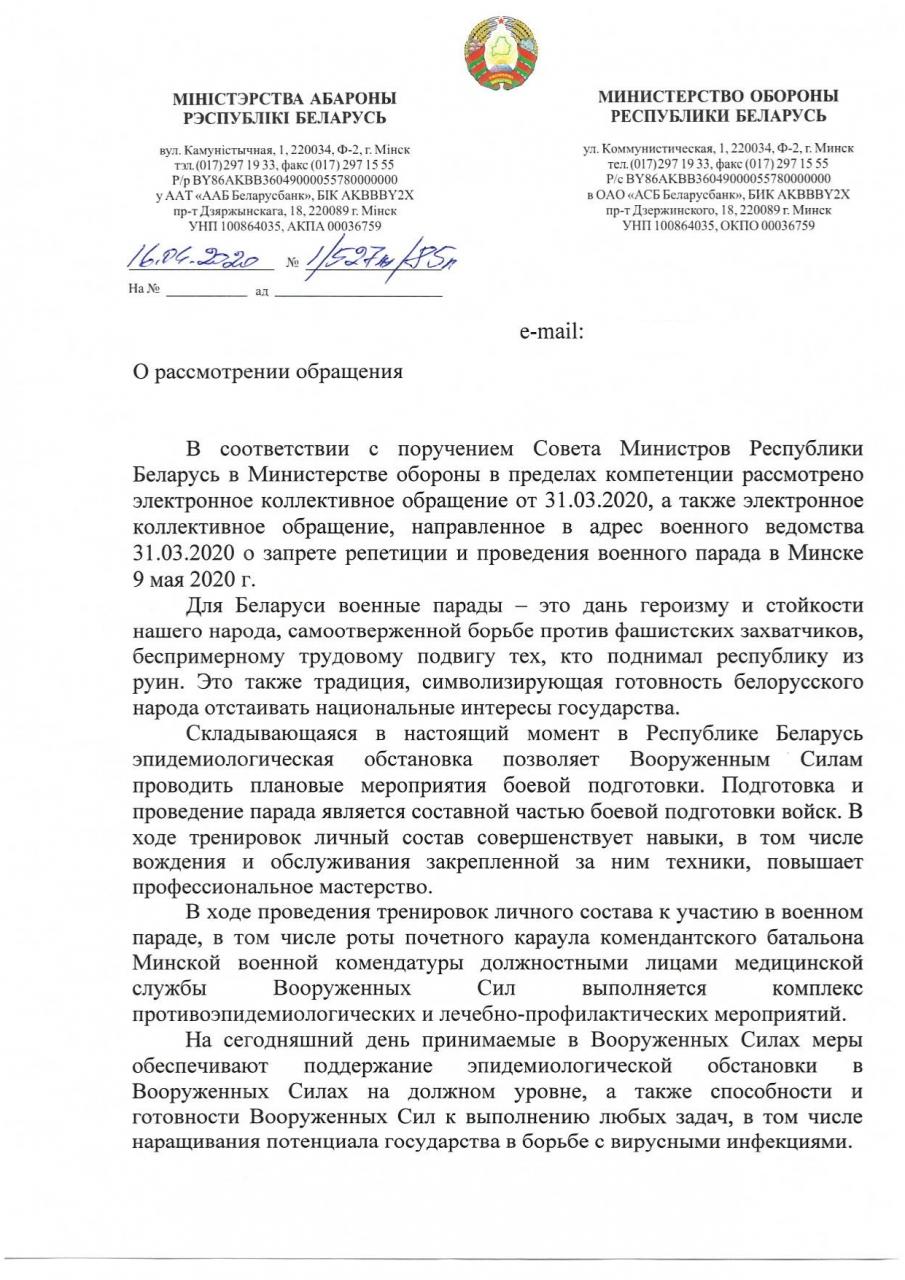 На платформе «Удобный город» под петицией «Запретить репетиции и проведение военного парада в Минске 9 мая 2020 года» опубликовали ответ на обращение Миноброны Беларуси. Он подписан министром обороны Виктором Хрениным.