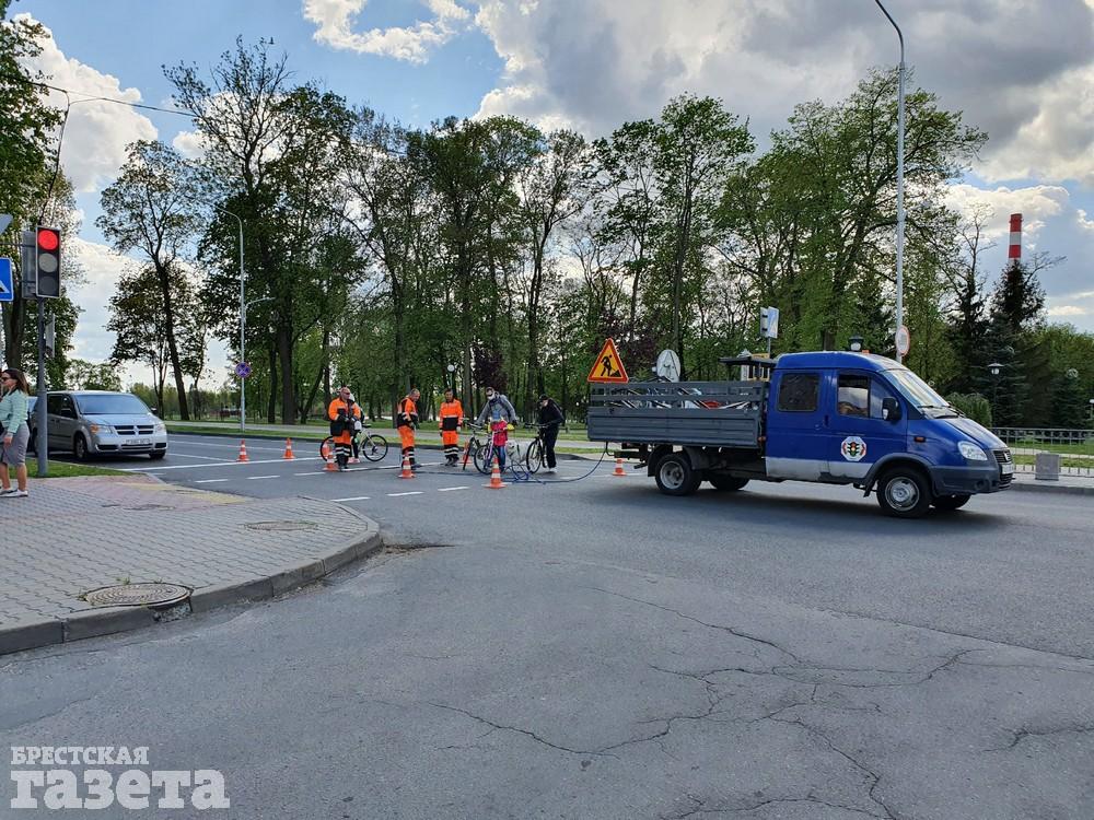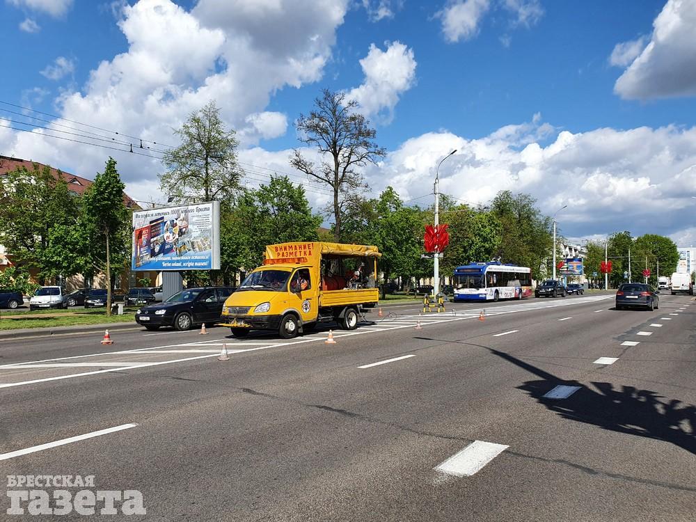 В четверг 7 мая в Бресте обновляли дорожную разметку на главных улицах. Корреспондент «БГ» застала работников дорожных служб в этот день на улице Ленина и на проспекте Машерова.
