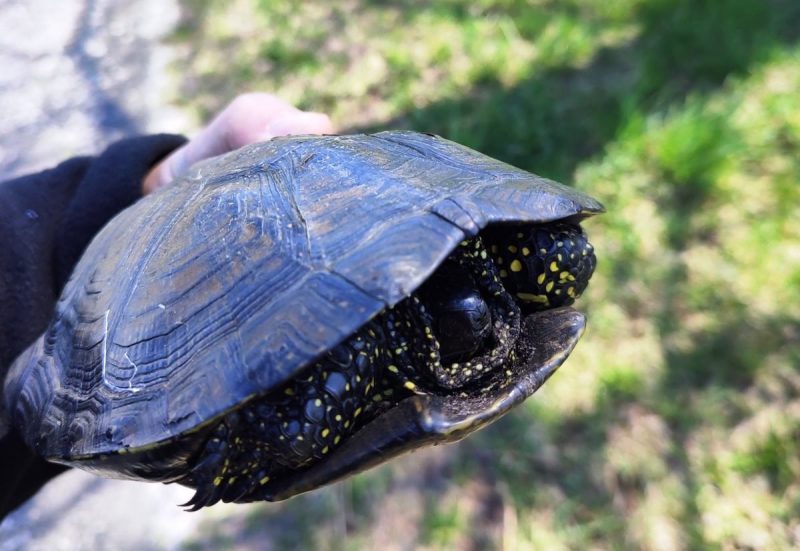 Проезжая на авто по округе, пинчанин обратил внимание на необычный «камень» прямо посреди проезжей части. Оказалось, что это европейская болотная черепаха. Судя по опубликованному фото, черепаха встрече была не рада — она сразу втянула под панцирь голову, хвост и лапки.