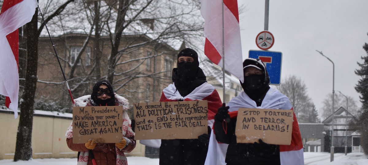 Учора днём ля будынка амбасады ЗША ў сталіцы Літвы прайшла акцыя пратэсту, галоўнай мэтай якой удзелінікі ставяць вызваленне ўсіх без выключэння беларускіх палітычных зняволеных.