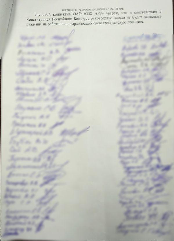 После того, как несколько работников ОАО «558-й авиационный ремонтный завод» были осуждены за участие в акциях протеста против фальсификации выборов, их коллеги написали коллективное обращение к городским властям. В числе главных требований – освобождение политзаключенных, отставка Александра Лукашенко и проведение честных выборов, сообщает Intex-press.