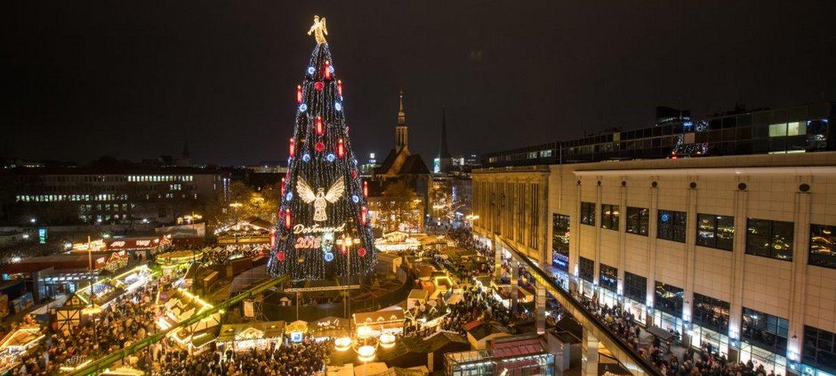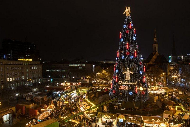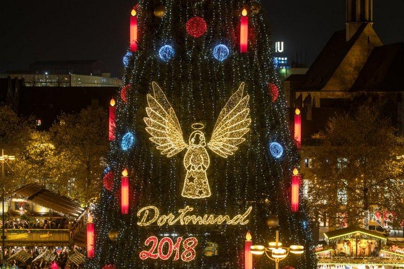 Рождественское дерево в Дортмунде представляет собой сборную конструкцию из 1 700 небольших елок, которые были специально выращены местными лесными хозяйствами. На установку 45-метровой елки потребовался месяц, потом ее украсили 48 000 праздничными фонариками, сообщает wr.de.