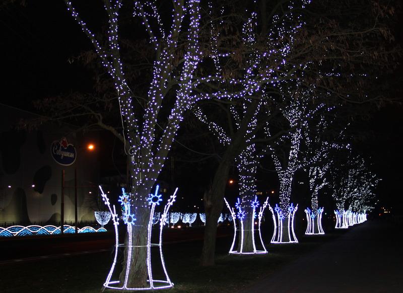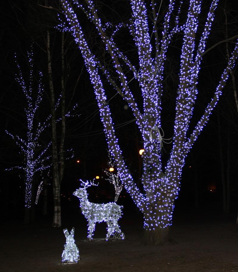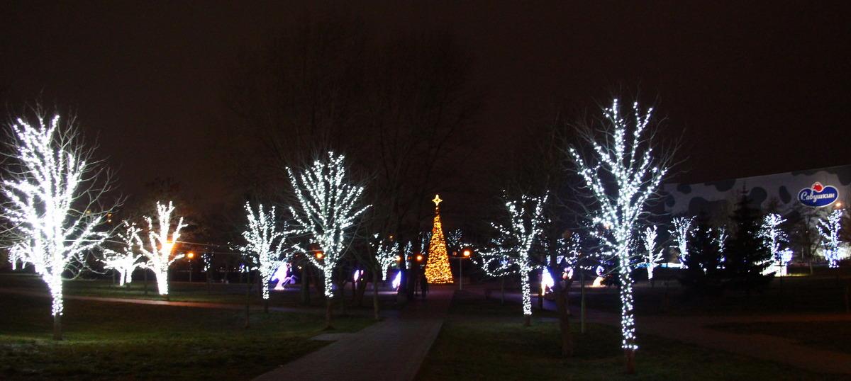 Завершает всю композицию аллея из 56 ярких светящихся деревьев по обе стороны парка. Самое большое дерево в самом «богатом» наряде расположилось у детской площадки в компании с зайцами и оленями. Длина гирлянды, использованной на его украшение, — 1 км 200 м!