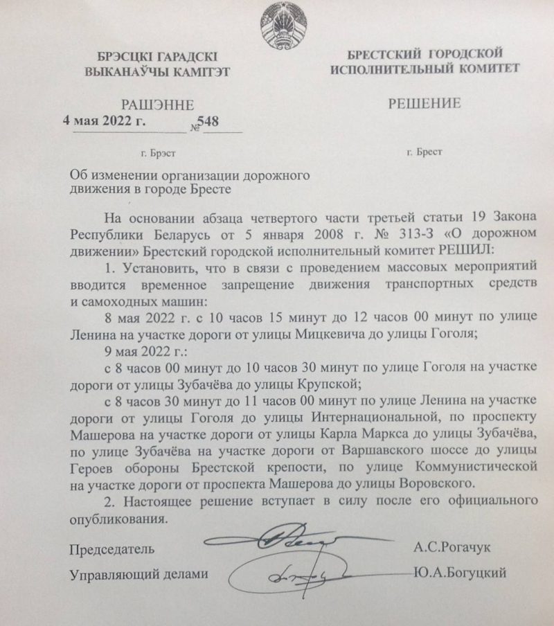 8 и 9 мая в Бресте будут закрыты некоторые участки дорог