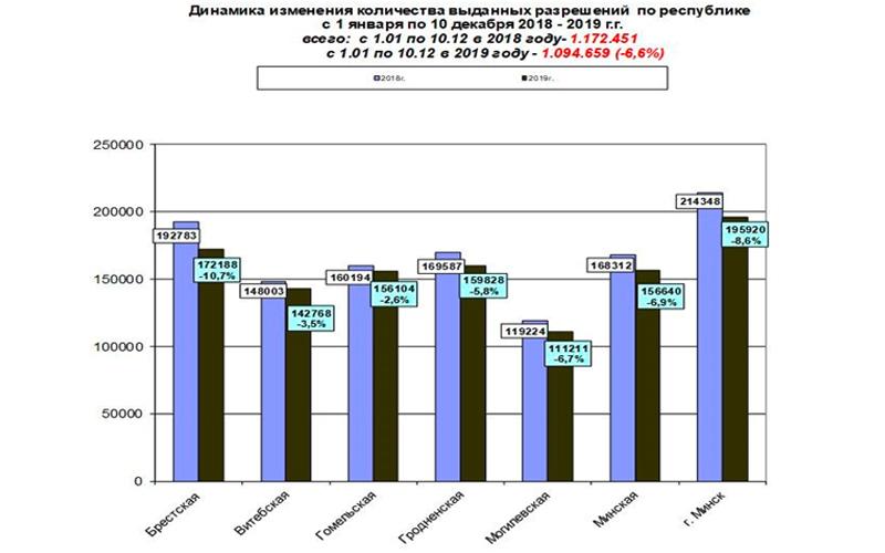 На втором и третьем местах по игнорированию получения разрешений на допуск к участию в дорожном движении Минск и Минская область. Там количество выданных в этом году разрешений уменьшилось на 18 428 (8,6%) и 11 672 (6,9%) соответственно.