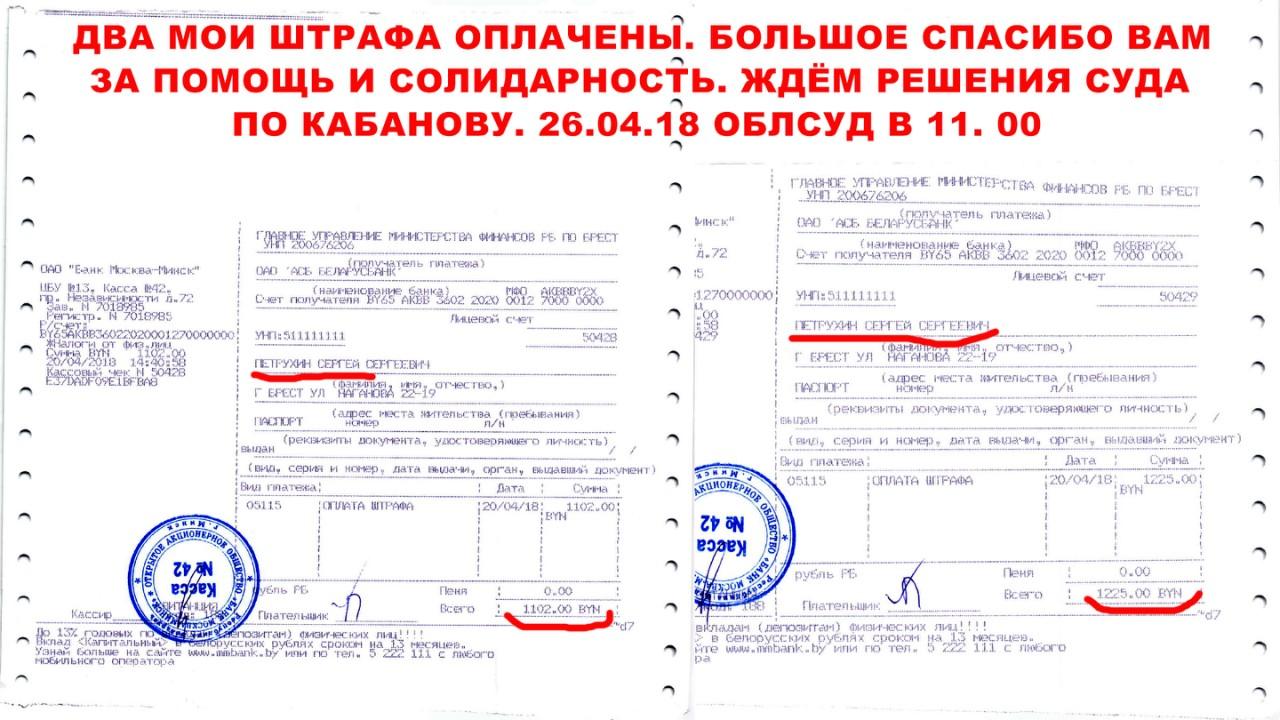 Брестский «народный репортер» Сергей Петрухин, который за последние несколько месяцев был неоднократно оштрафован на большие суммы, выплатил штрафы. Согласно квитанциям, 20 апреля он внес в кассу банка в общей сложности 2 327 рублей.