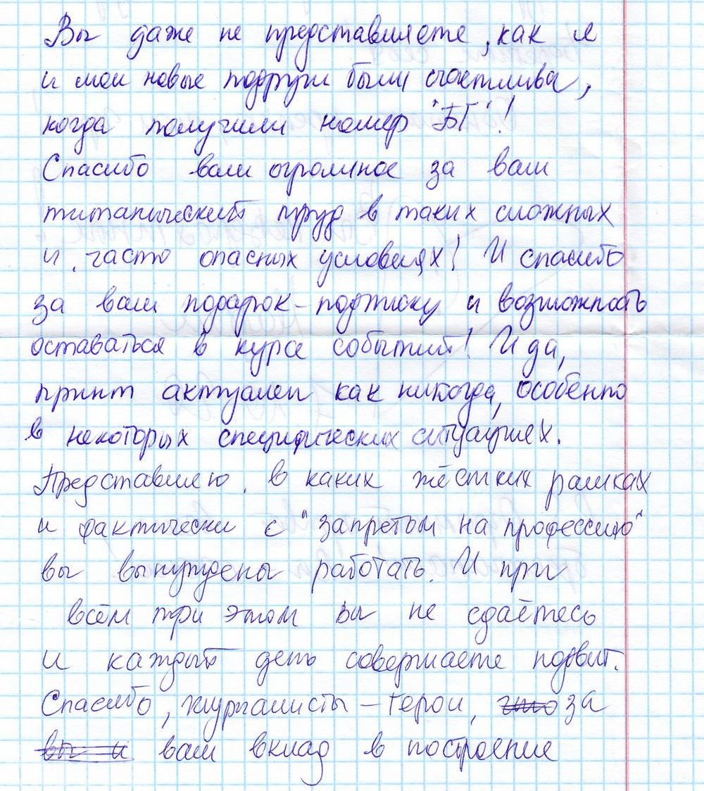 Мария прислала в редакцию недлинное, но очень эмоциональное и теплое письмо. Очевидно, что даже за решеткой она не теряет своего оптимизма и энергии.