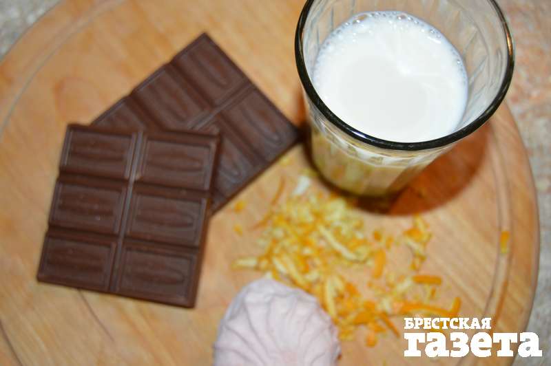 Надо: 200 г молока, 100 г шоколада, цедра одного апельсина, 0,5 зефира, корица, сахар и мускатный орех по вкусу.