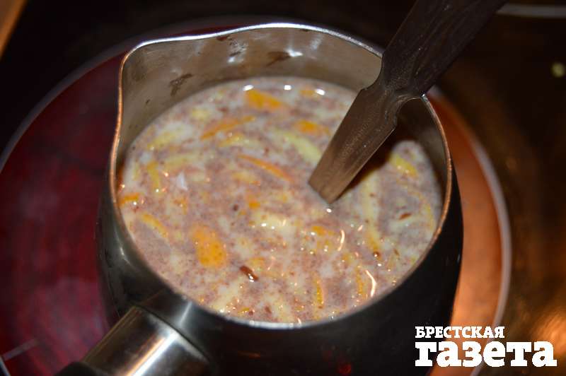 Готовим: Молоко налейте в кастрюльку и поставьте на плиту.