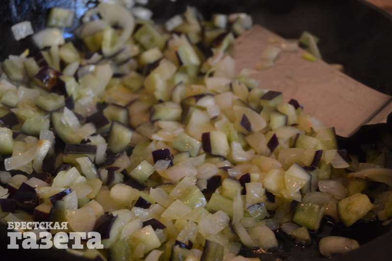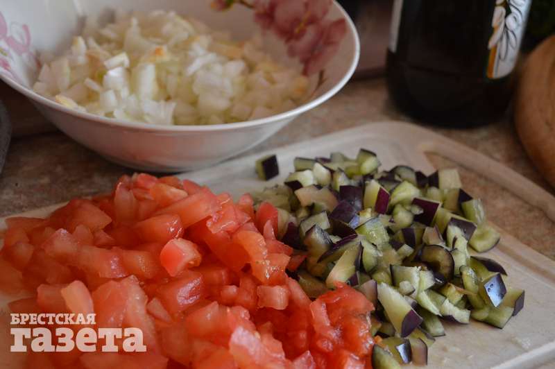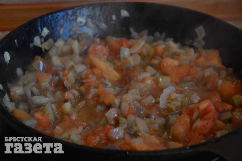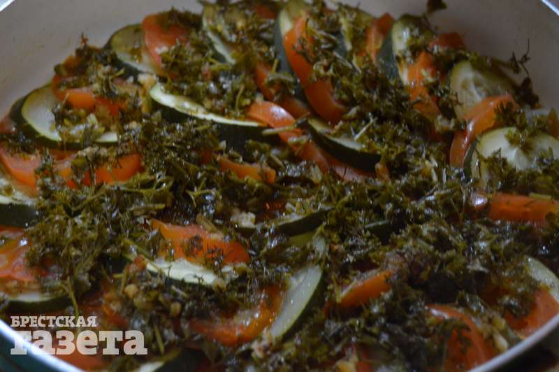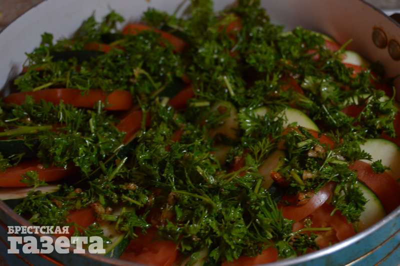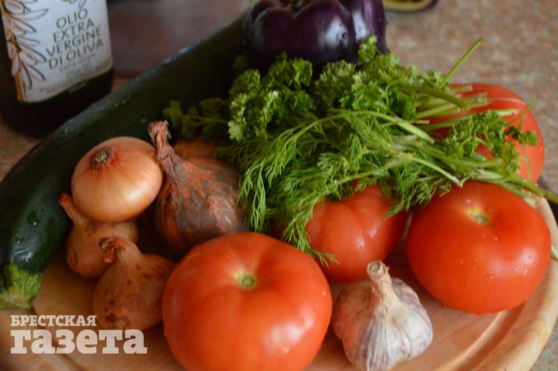 Надо: 1 цукини, 6 помидоров, 1 болгарский перец, 1 средняя луковица, 4 зубка чеснока, укроп, петрушка, оливковое масло, соль, сахар, молотый перец.