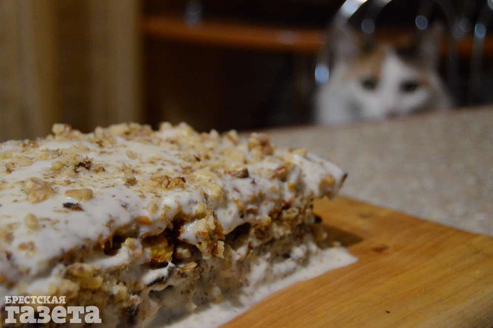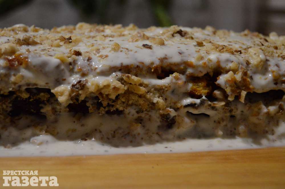Испеченный корж разделите на три части. Каждую промажьте творожным кремом (творог, смешанный с медом) и посыпьте орешками, выкладывая друг на друга коржи слоями.