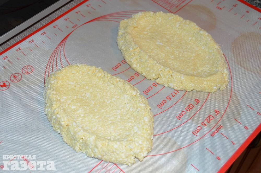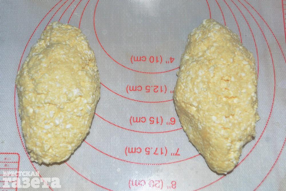 Разделите творожное тесто пополам, слепите продолговатые котлетки и положите их на противень, застланный силиконовым ковриком.