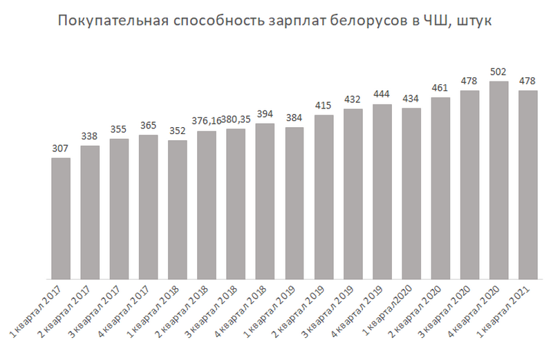 «Несмотря на квартальные колебания, за последний год покупательная способность зарплат, выраженная в чарках и шкварках, выросла. Так, в 1 квартале 2021 года среднестатистический белорус заработал 478 чарок и шкварок, а в аналогичном периоде прошлого года – 434 чарки и шкварки. Прирост составил 10,1% или 44 ЧШ», — уточняют авторы исследования.