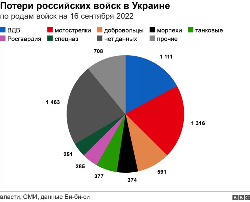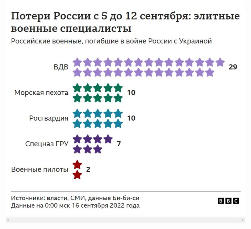 Стремительное контрнаступление Украины в Харьковской области привело не только к тому, что россияне оставили ряд ранее захваченных ими населенных пунктов, но и к потерям личного состава. На основе открытых источников Би-би-си удалось установить, что с 5 по 12 сентября Россия потеряла в Украине более 200 военных, в том числе 57 элитных специалистов — солдат и офицеров спецназа, морской пехоты, лучших частей ВДВ и Росгвардии.
