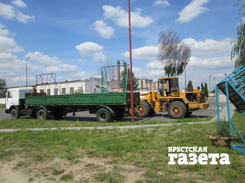 Первое же утро после Дня защиты детей не было добрым для маленьких брестчан и их родителей из микрорайона Березовка. По словам жильцов, 2 июня примерно в 11 часов на детской площадке дома №100А по ул. Мошенского появились какие-то люди и начали ее опустошать, буквально вырывая из земли все ее оборудование. А потом они сложили все в грузовики и трактор, чтобы вывезти со двора.