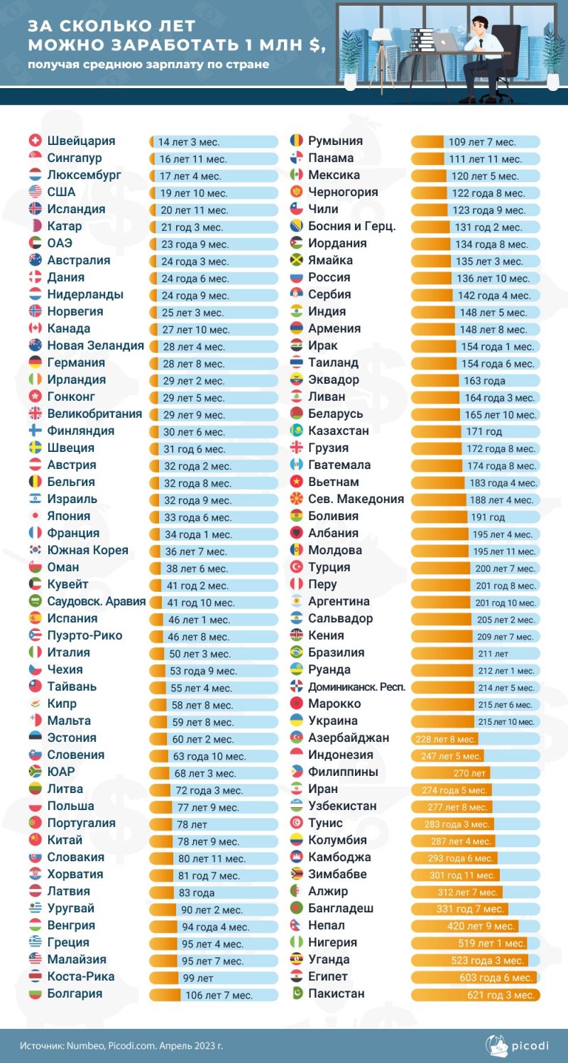 Работая десятки лет, люди зачастую не задумываются, сколько денег они заработали в совокупности. В этом исследовании аналитики Picodi.com посчитали, за сколько лет жители разных стран могут заработать миллион долларов, получая среднемесячную заработную плату по стране.