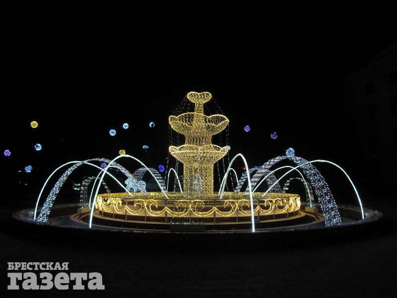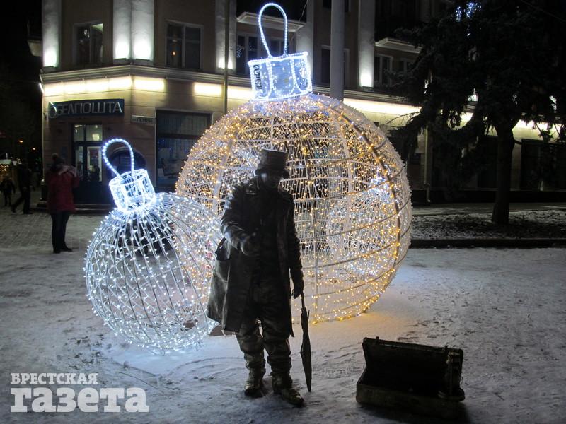Сейчас можно увидеть, что елку украсили логотипами к 1000-летию Бреста, но она пока не светится. На площади уже установили карету, запряженную оленем, новогодний шар, колокольчик с язычком, который двигается из стороны в сторону.