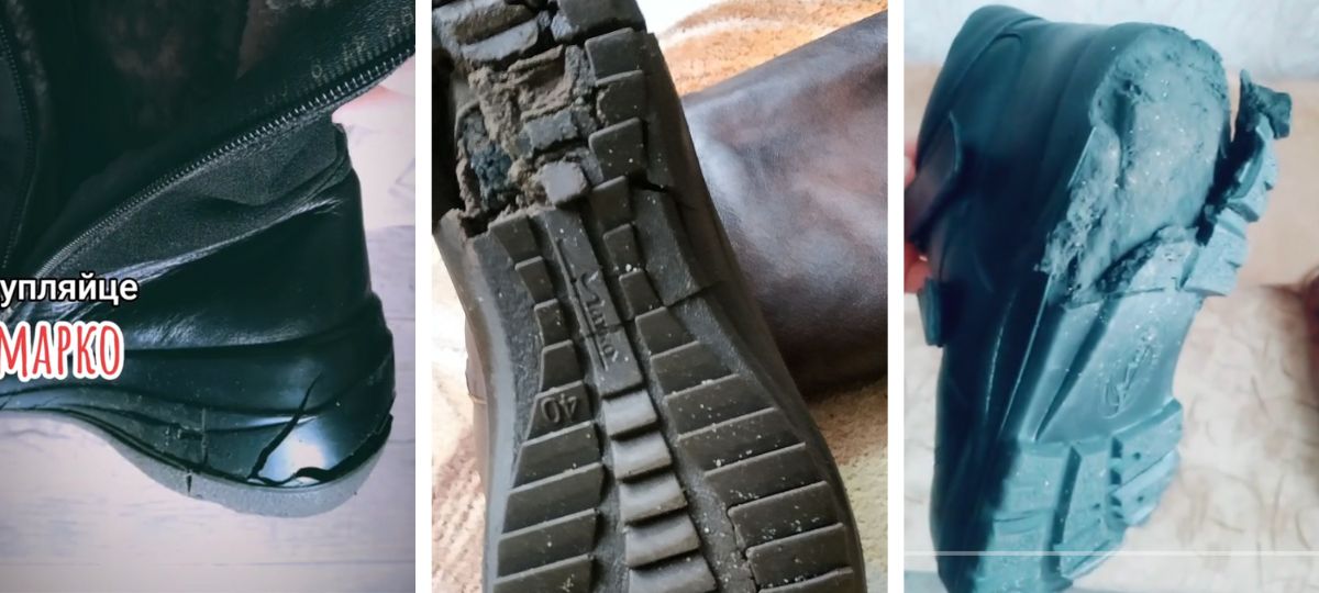 В другом — женщина показывает треснувшую и раскрошившуюся подошву.