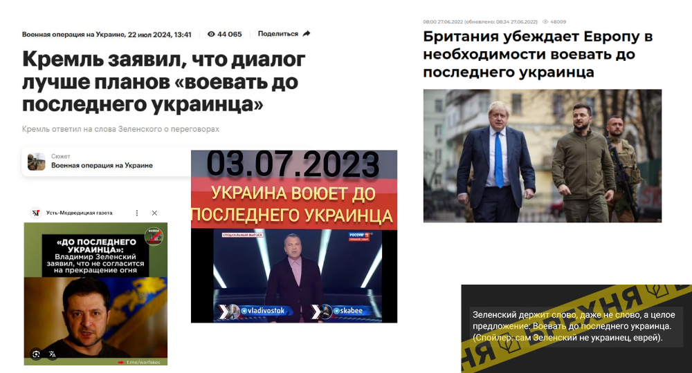 Кроме того, издание Gazeta.Ru 27 июня 2025 цитирует экс‑помощника Леонида Кучмы Олега Соскина, который утверждает, что Зеленского обвинили в том, что он «готов воевать до последнего украинца». «Сколько еще осталось? Миллионов 20 там на этой территории вместе с остатками младенцев. <…> До последнего украинца», — сказал он, подчеркнув, что Зеленский готов к такому развитию событий. При этом ни сам президент Украины, ни официальные украинские заявления не содержат таких слов — это интерпретация маргинальной российской пропаганды, выданная за цитату.