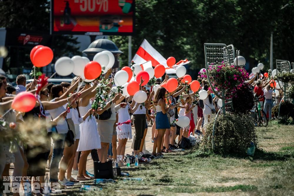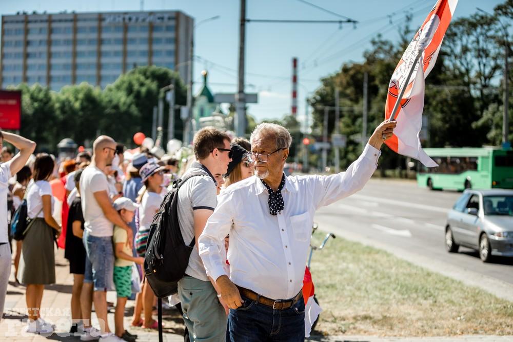 В живой цепи стояла и сильная половина, у некоторых мужчин были большие бело-красно-белые флаги.