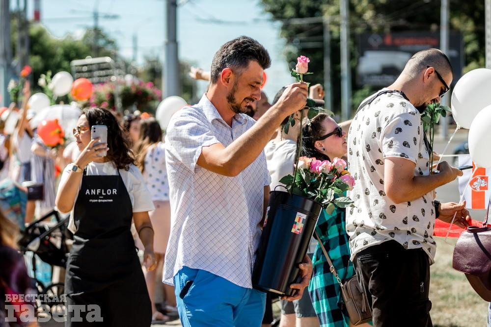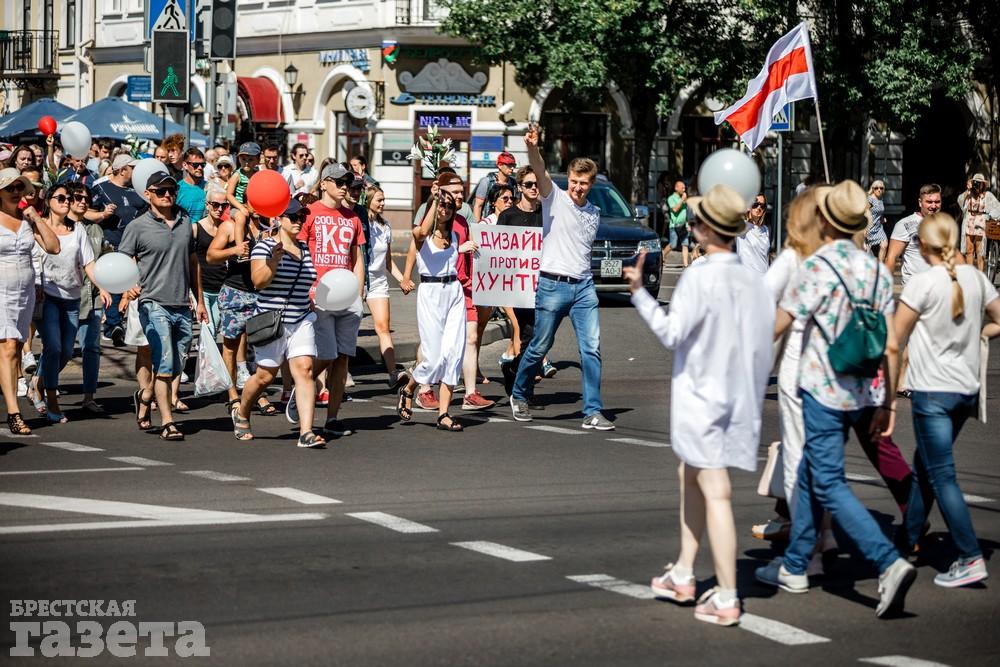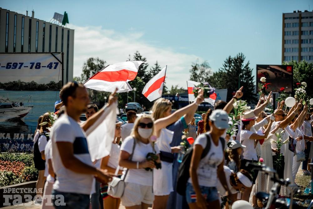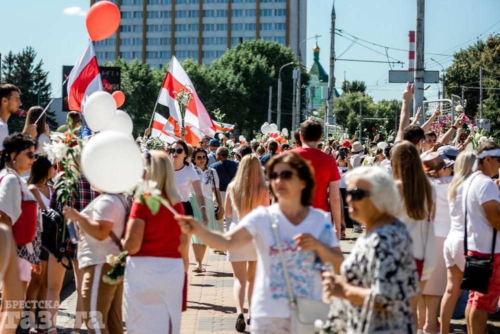 Некоторые протестующие пришли с плакатами: «Жыве Беларусь», «Освободите мир от насилия».