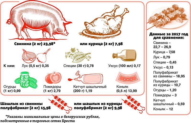 Так, пикник на компанию из четырех человек с самостоятельно приготовленным шашлыком из свинины обойдется этим летом как минимум в 44,94 белорусского рубля (в 2017 году это удовольствие потянуло на 40,86 рубля), из курицы — в 28,24 рубля (25,74 рубля — год назад).